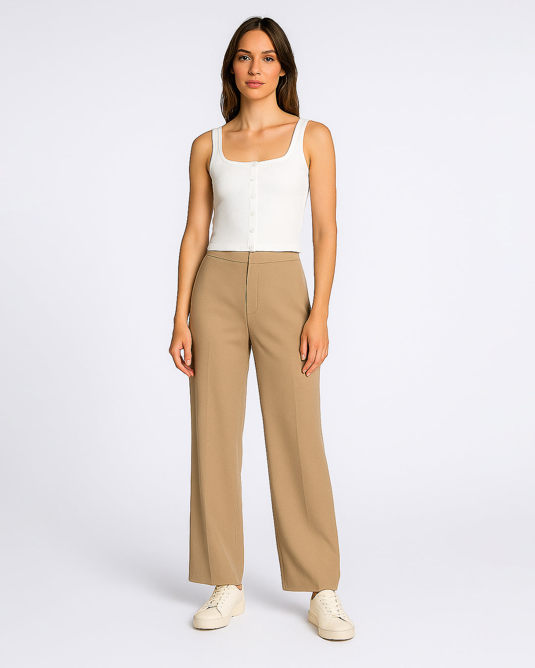 - Button-Down Front: Features a full line of matching white buttons for a chic, modern look.