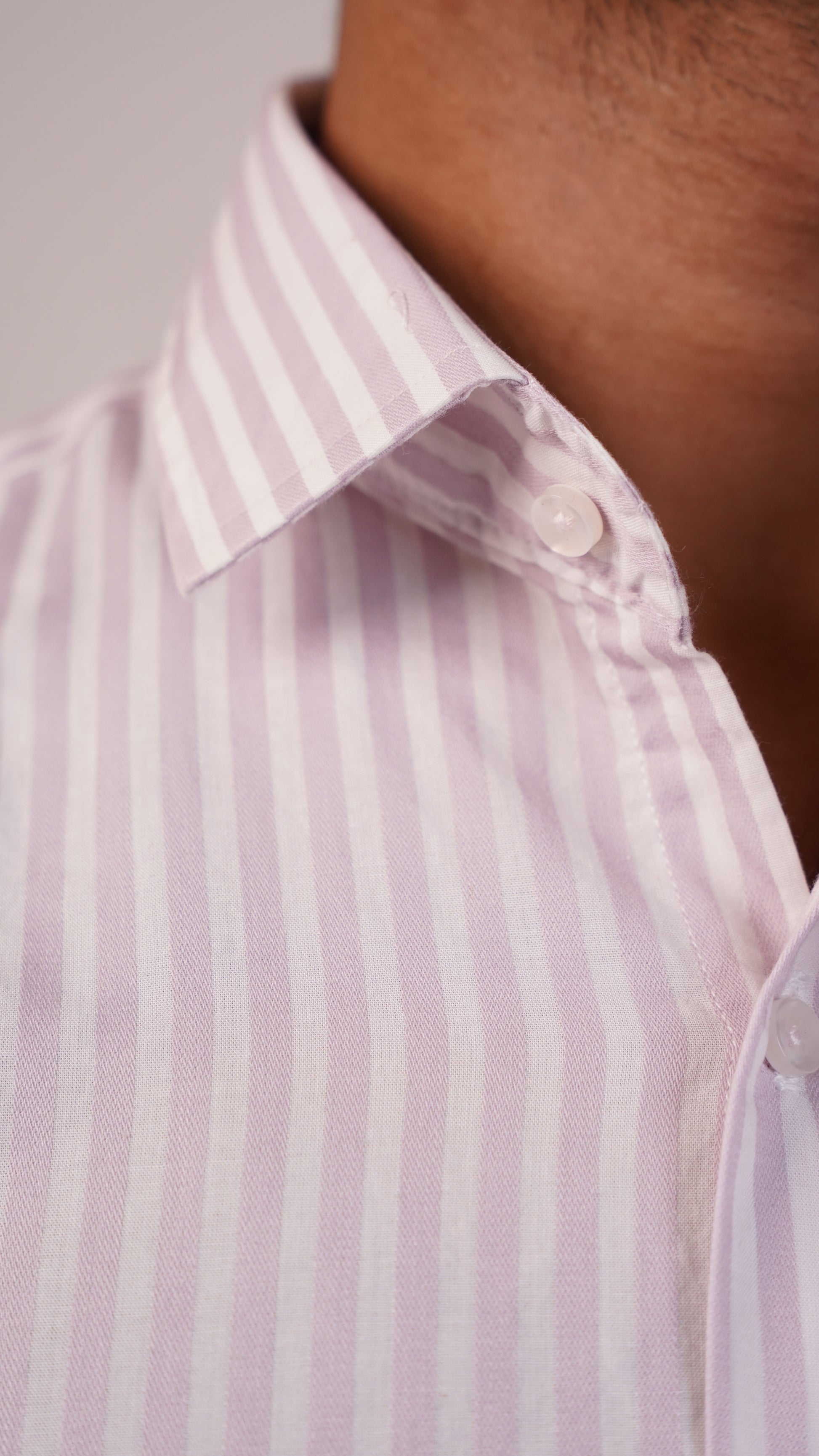 - Hardware: Traditional four-hole resin buttons in a neutral white to match the stripe.