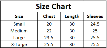 | Size | Chest | Length | Sleeves |