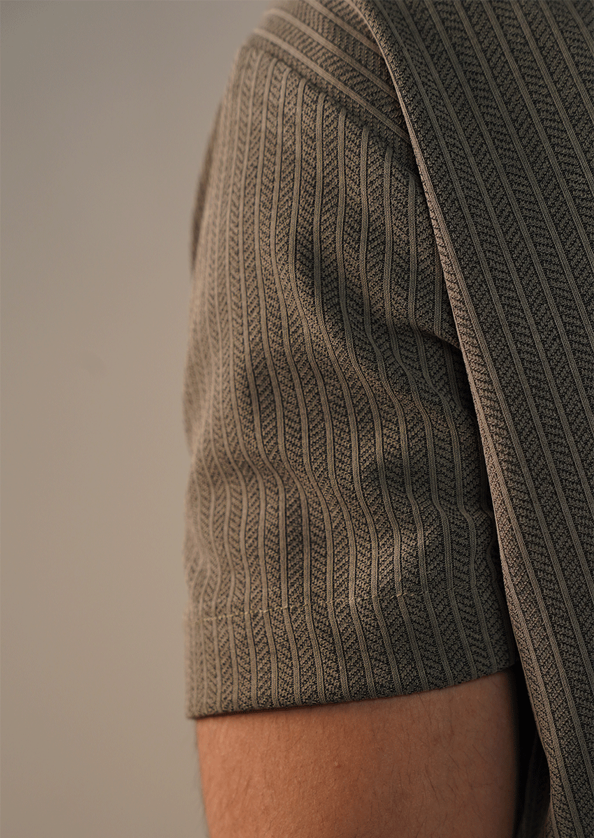 - It features a distinctive chevron (herringbone) stripe pattern running vertically, giving the shirt a heavy, premium feel with significant visual depth.