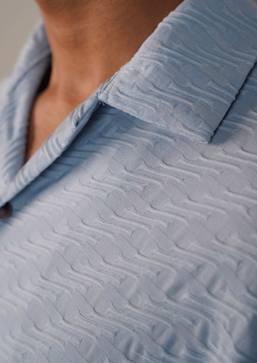 - Construction: Features a standard short-sleeve silhouette with a clean-finished placket and matching blue stitching throughout.