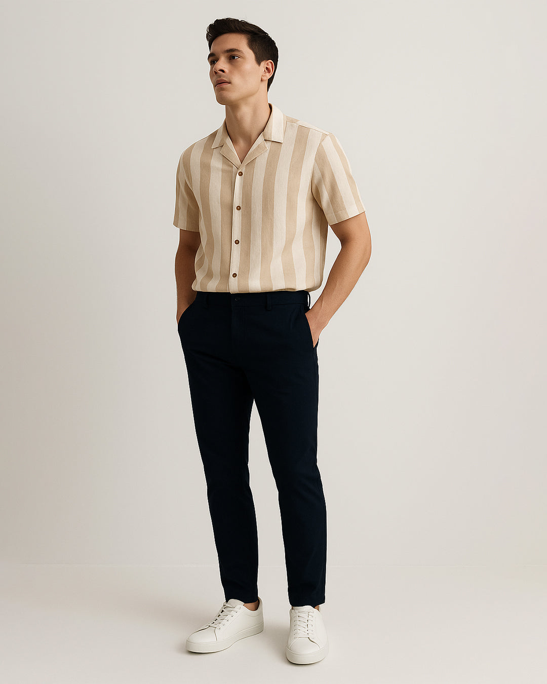 PullNBear Branded Men’s Beige Stripe Button-Down Shirt MCS-30