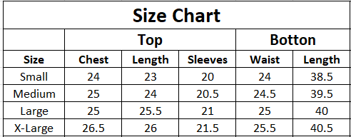 | Size | Chest | Length | Sleeves | Waist | Length |