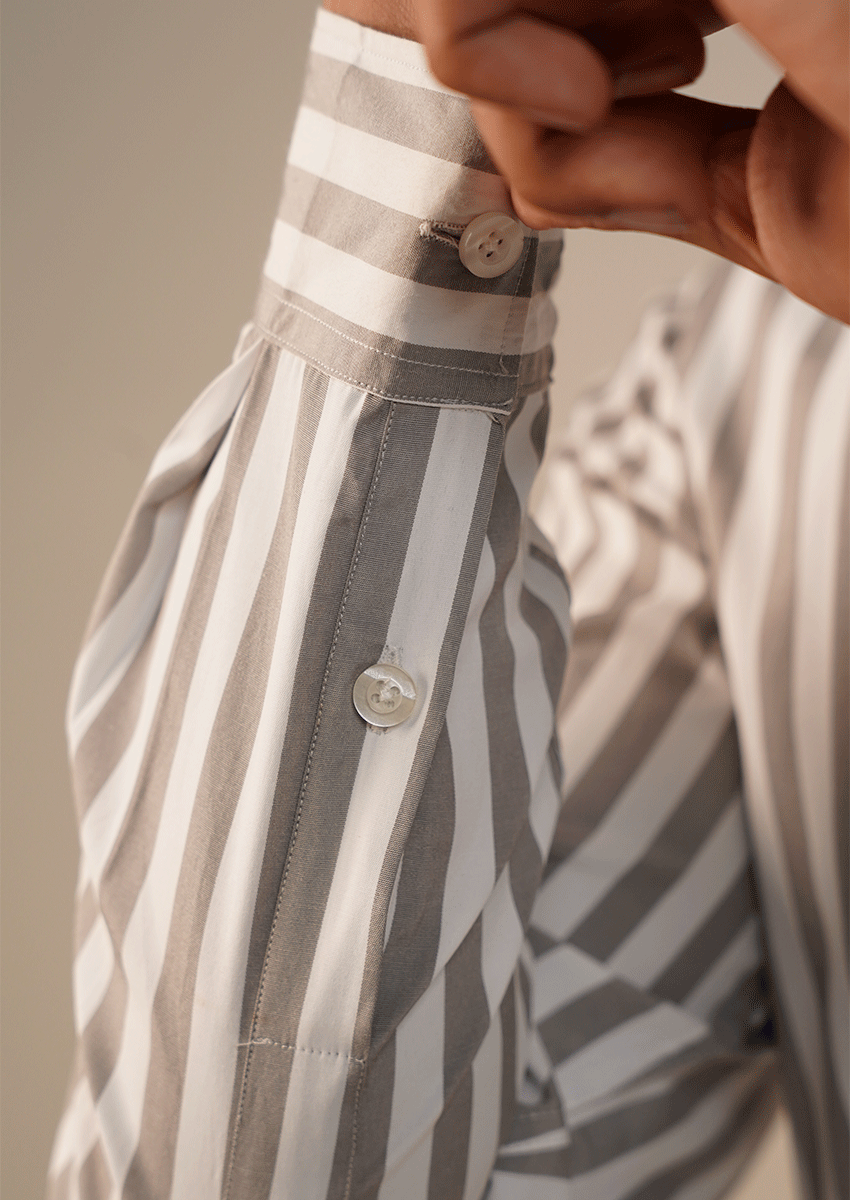 - Cuffs: Squared Single-Button Barrel Cuffs with a horizontal stripe contrast.